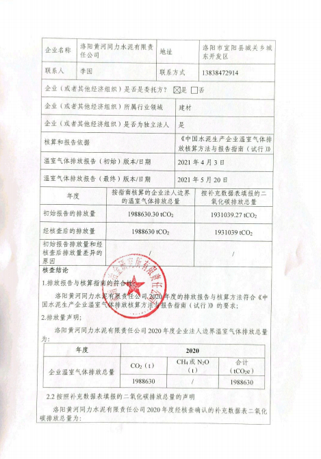 洛陽黃河同力水泥有限責任公司2020年度溫室氣體排放核查報告